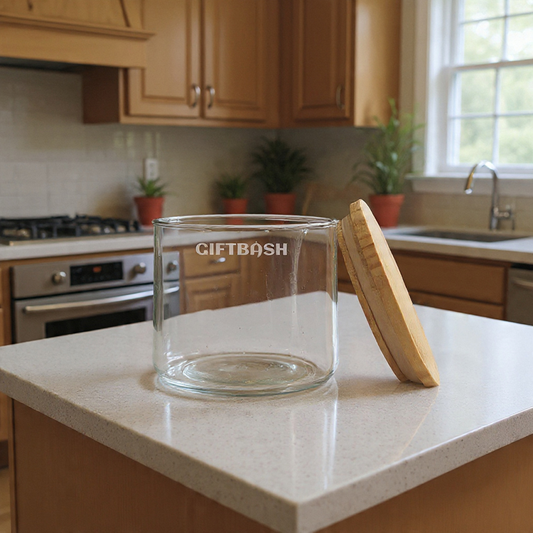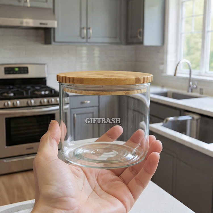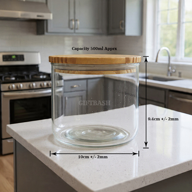 *GIFTBASH 500ml Clear Round Glass Jar With Airtight Wooden Lid for Candle Making and Multipurpose Use.